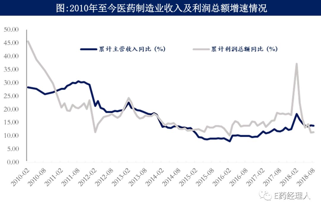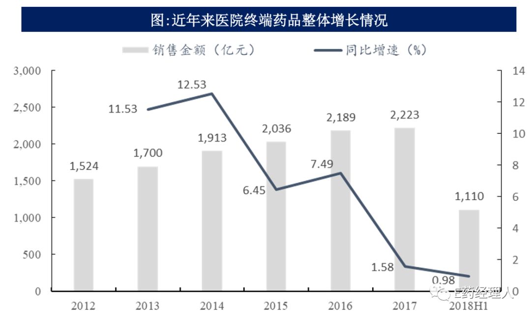 | 2018年受到医保控费、药品降价以及控制药占比等行业政策影响,医院终端增速持续低迷,医院市场总体增速从2017全年的1.58%下 降至2018上半年的0.98%,其中部分原因为处方外流,尤其是慢病用药向基层下层。 具体到季度层面,2018第二季度同比增长1.30%,相比2018第一季度的0.65%有所提升。截止最新数据,2018年前1-7月城镇基本医疗保险参保人数12.02亿同比增长10%,筹资额11995亿,同比增长15%,支出8959亿,同比增长21%。参保人数12.02亿比去年同期增长10%。2018年1~8月,医药制造业累计收入增速13.8%,较去年略有提升,累计利润总额增速11.4%,较去年同期下滑明显。2018上半年增速较高主要原因是2017年下半年以来两票制的实施使药企由低开转为高开,造成收入大幅提升。
