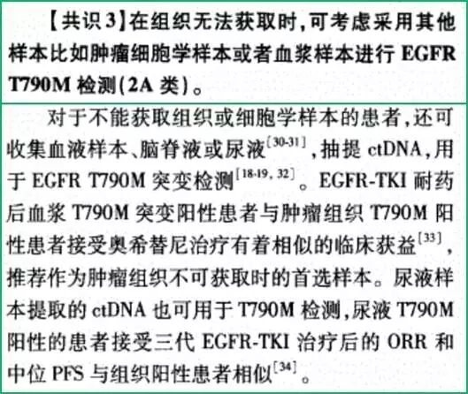 CSCO《原发性肺癌指南》 ► CSCO肿瘤生物标志物专家委员会《中国非小细胞肺癌患者EGFR T790M基因突变检测专家共识》也指出,在组织无法获取时,可考虑采用其他样本,比如肿瘤细胞学样本或者血浆进行EGFR T790M检测(2A类推荐)。
