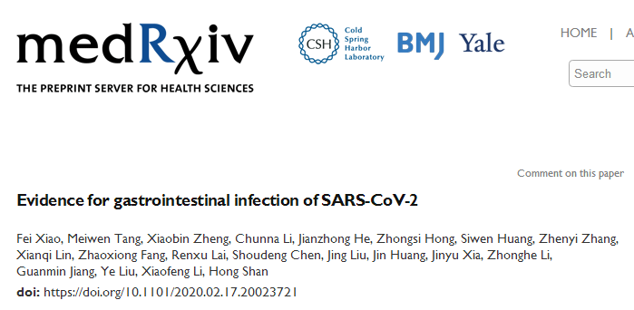 2020年2月20日,中山大学附属第五医院单鸿课题组在预印本网站medRxiv上发表论文,题为“Evidencefor gastrointestinal infection of SARS-CoV-2”,研究发现了新冠病毒胃肠道感染的证据。