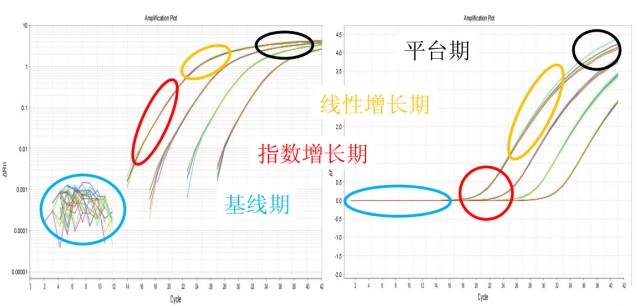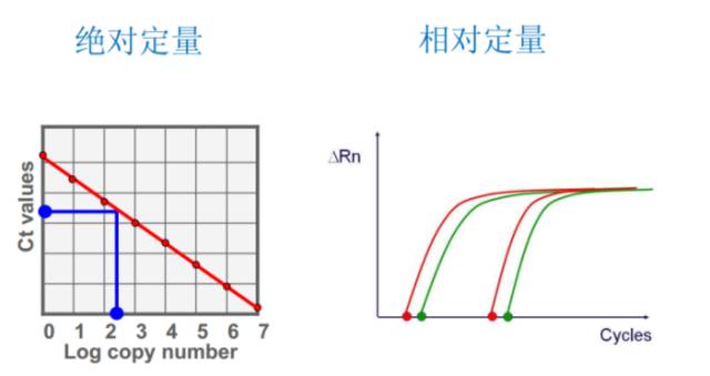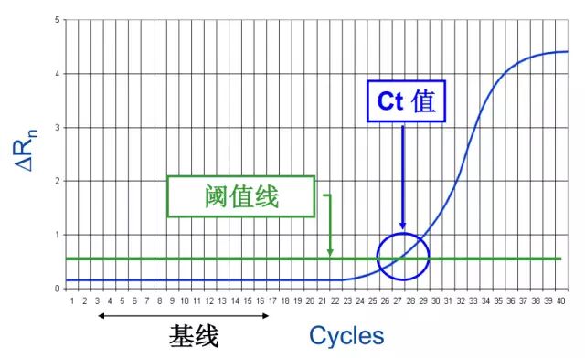 传统的PCR进行检测时,扩增反应后需要进行染色处理及电泳分离,并且只能作定性分析,不能准确定量,易造成污染出现假阳性,使其应用受到限制。实时定量PCR技术不仅实现了对模板的定量,且具有灵敏度高、特异性和可靠性更好、自动化程度高和无污染的特点,使得荧光定量PCR逐渐取代常规PCR。 在PCR扩增反应的最初数个循环里,荧光信号变化不大,接近一条直线,这样的直线即是基线,这条线是可以自动生成也可以手动设置的。之后反应会进入指数增长期,这个期间扩增曲线具有高度重复性,在该期间,可设定一条荧光阈值线,它可以设定在荧光信号指数扩增阶段任意位置上,但一般会将荧光阈值的缺省设置是 3-15 个循环的荧光信号的标准偏差的10 倍。每个反应管内的荧光信号到达设定的阈值时所经历的循环数被称为CT值,这个值与起始浓度的对数成线性关系,且该值具有重现性。