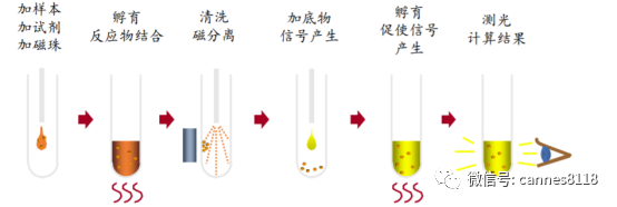 IVD空间大,孕育千亿市值企业 国内高需求和技术强优势推动发光高增长 化学发光壁垒高,外资占据主要份额 检测需求决定技术壁垒,仪器试剂缺一不可。 化学发光系统开发难度较大,主要原因在于被测物在样本中的浓度低:生化诊断检测的糖类、 脂肪类等在人体内的含量普遍为g/L-μg/L水平,而免疫诊断检测的抗原、抗体等仅为μg/L—pg/L水平,两者差别约106倍,因此化学发光系统从研发、生产到使用都需要更加精密和规范。 基于检测需求的原因,化学发光系统一般为封闭式,这对企业的仪器与试剂研发能力都提出了较高的要求:(1)就仪器而言,全自动化学发光免疫分析仪实现各步反应的自动化、温度控制、结果输出等。检测仪器涉及的学科复杂,当前国内企业的精密仪器制造能力尚有较大的提升空间、实现规模化生产的厂家数量也较少,因此仪器的整体水平决定了检测系统的下限。 下图:化学发光仪器实现各步反应的自动化,决定系统下限