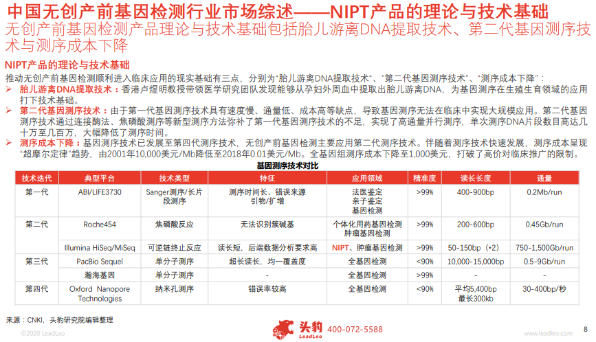 导读 无创产前基因检测又称无创胎儿染色体非整倍体检测,是一种针对胎儿染色体异常情况的产前检测技术。基于中国政府鼓励优生优育、加强服务监管的背景,居民对无创产前基因检测的需求不断增加,无创产前基因检测行业得以快速发展,其市场规模由2014年的18.4亿元增长至2018年的68.3亿元,年复合增长率达38.8%。在中国无创产前基因检测行业中,市场集中度高,华大基因与贝瑞和康两家企业占据市场份额总数超过40%。 无创产前基因检测作为孕前检测的重要方法,行业与医疗、生育等相关行业相互影响、协同发展。2015年至2019年间,无创产前基因检测行业支持性政策的陆续发布与监管政策的日渐趋严,直接促进了无创产前基因检测向标准化发展、推动检测服务受众快速增加,政策对行业整体影响呈现利好状态。 2015年起,中国政府陆续出台无创产前基因检测规范化政策与支持性政策,市场红利与政府支持吸引众多生物医药企业涉足无创产前基因检测,博奧生物、达瑞生物、凡迪基因陆续进入市场,打破华大基因与贝瑞和康完全垄断的市场格局。华大基因与贝瑞和康两家龙头企业市场占有率总计由2013年的80%降低至2018年的40%行业竞争加剧。 为避免医院自主检测服务抢占第三方检测公司原有市场,检测公司开始与医院共同建设联合实验室以实现双方共赢,如华大基因与中山六院、汕头市中心医院等合作伙伴共同打造联合实验室,贝瑞和康与北京协和医院合作建立高通量基因检测中心实验室。在合作过程中,检测公司以更低价格提供仪器设备,医院则将需求市场让渡给检测公司。此外,医院与检测公司也能针对医院需求共同进行医学研究、产品研发。联合实验室模式不仅实现了双赢,而且加速了新技术与产品的研发,将成为未来第三方检测公司拓宽市场的主要模式之一。 参考出处:头豹研究院-中国无创产前基因检测行业概览 https://pdf.dfcfw.com/pdf/H3_AP202009031406986512_1.pdf?1599149224000.pdf 免责声明:文章内容仅供参考,不构成投资建议。投资者据此操作,风险自担, 关于对文中陈述、观点判断保持中立,不对所包含内容的准确性、可靠性或完整性提供任何明示或暗示的保证。请读者仅作参考,并请自行承担全部责任。本公众号发布的各类文章重在分享,如有侵权请联系我们,我们将会删除。 |