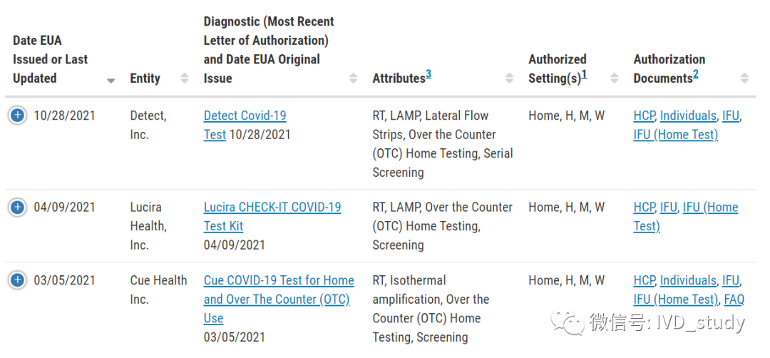 为了解决家庭自检产品供应问题时,官员们指出,政府已投资30亿美元加速快速测试的制造。 获FDA EUA批准的家庭自检OTC试剂汇总免疫试剂OTC汇总: 分子试剂OTC汇总:一共3家获得了FDA EUA OTC批准 最后,从FDA数据上看,家庭自检的产品相比获得EUA批准的试剂依然是少数,市场供不应求,依然留有后续的市场空间。尤其后续新冠逐渐流感化,呼吸道感染高发期,可想而知。 |