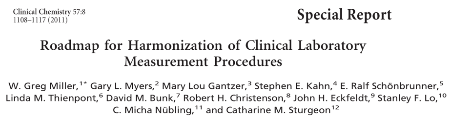 病人标本检测结果一致性 冯仁丰 3、考虑其他的分析问题 除了校准溯源性外,完整叙述实际被检测的质量和对质量,需要适当的检测程序特异性,视为达到不同检测程序间结果一致性重要考虑的。注意被测量的定义!近期国际计量术语学版本上对被测量的定义为“预期被检测的量”。对于许多生物标志物,在预期被检测的分子或生物物质是不同的,什么才是实际被检测的。 例如,考虑肌钙蛋白I,它在血液中作为多个蛋白的复合物,而且随着一个心肌梗死的不同时间复合物的组成在变化。用于免疫检测肌钙蛋白I的抗体会与该蛋白双向结构的三个方向上不同的决定簇结合。而且,预期被检测的被测量是肌钙蛋白I,但实际被检测的量由决定簇确定,这是由给定的检测程序中使用的抗体决定的,因为不同的检测程序使用了不同的抗体,检测程序没有检测相同的量,所以不同厂商检测肌钙蛋白I不一致是各家厂商的肌钙蛋白I被测量不一。 因为没有阐明考虑为“肌钙蛋白I”的特定分子实体。达到一致性的基本要求是合适的叙述,在一个分子水平上,作为一个被给定的条件下的生物标志物被检测的量。不同常规临床实验室检测程序间结果一致性的另一个基本要求是,所有程序对被检测的量具有适当的分析特异性。如果一组常规程序没有检测相同的量,这些程序的结果就不可能会一致。 同样,如果常规程序受临床样品中非检测量的物质影响,则该程序的结果就不可能与其他程序检测相同生物标志物的结果一致。可惜,厂商因考虑经费和生产能力,对一些常规检测程序的特异性很少考虑。因此,厂商的检测程序的结果可以与其他程序的结果一致前,必须要改进检测程序的性能。 4、检测结果一致性的国际倡议 实验室结果一致的重要性被全球的许多专业和公共卫生组织认识。一个改进一致性的长期委员会的国际组织是IFCC。IFCC科学部已经负责了许多委员会和工作组,为临床重要的被测量发展参考检测程序和参考物质。除了参考系统外,IFCC负责人倡议参考区间、术语、和检验医学的其他领域等的努力。 1998年,欧盟(FC)的98/79/EC的体外医学设施导则,要求在整个欧共体(EU)的检测程序具有校准溯源性到较高等级的参考系统。为了响应EU directive指令,IFCC、国际国际度量衡委员会、和国际实验室认可协作组织,于2002年形成了检验医学溯源性联合委员会(JCTLM)。JCTLM保留了参考检测程序、参考检测实验室、和参考物质的清单,它们均被审核符合每个类型资源的可应用的ISO标准。由JCTLM列出的清单,已经成为被体外诊断厂商用于校准溯源性的某个参考系统组成的实际要求。JCTLM已经更新了工作组1的质量手册,预期被用作临床实验室检测程序的共同校准品的新的参考物质,要求上交具有互换性信息。 WHO提供了很多参考物质作为“国际标准”和“参考试剂”,被诸如血液安全、感染疾病、和内分泌领域用作检测程序的共同校准品。历史上,WHO没有确认这些物质的互换性,许多报告已经展现了溯源性到这些物质的,没有实现互换性,因为它们不是可互换的。2013年,WHO召开了会议讨论互换性要求和确定了在以后的参考物质上必须考虑互换性。 WHO物质的另一个局限性已经发生,因为在以新批号的物质替代已经耗尽的参考物质时,没有要求去确保设定值的一致性。但是,情况很复杂,因为在科学上的进展的一些情况,会使替代批号的技术上优于一个较老批号的,因此在设定值上必定会有变化。 2010年由AACC学会组织建议,于2013年成立了临床实验室检验结果一致性国际联盟(ICHCLR );它的使命是“通过一致性改进临床实验室检测的国际论坛。”会议建议协调和确定一致性活动需要的改进优先次序,以便最好地满足全世界实验室医学的需要。形成的ICHCLR去提供:依据临床的重要性和技术可行性,对被测量一致性优先次序的系统方式,去实现一致性;对全球一致性活动信息网站,以避免努力的重复;和对没有参考检测程序的被测量实施一致性,看来正在发展。