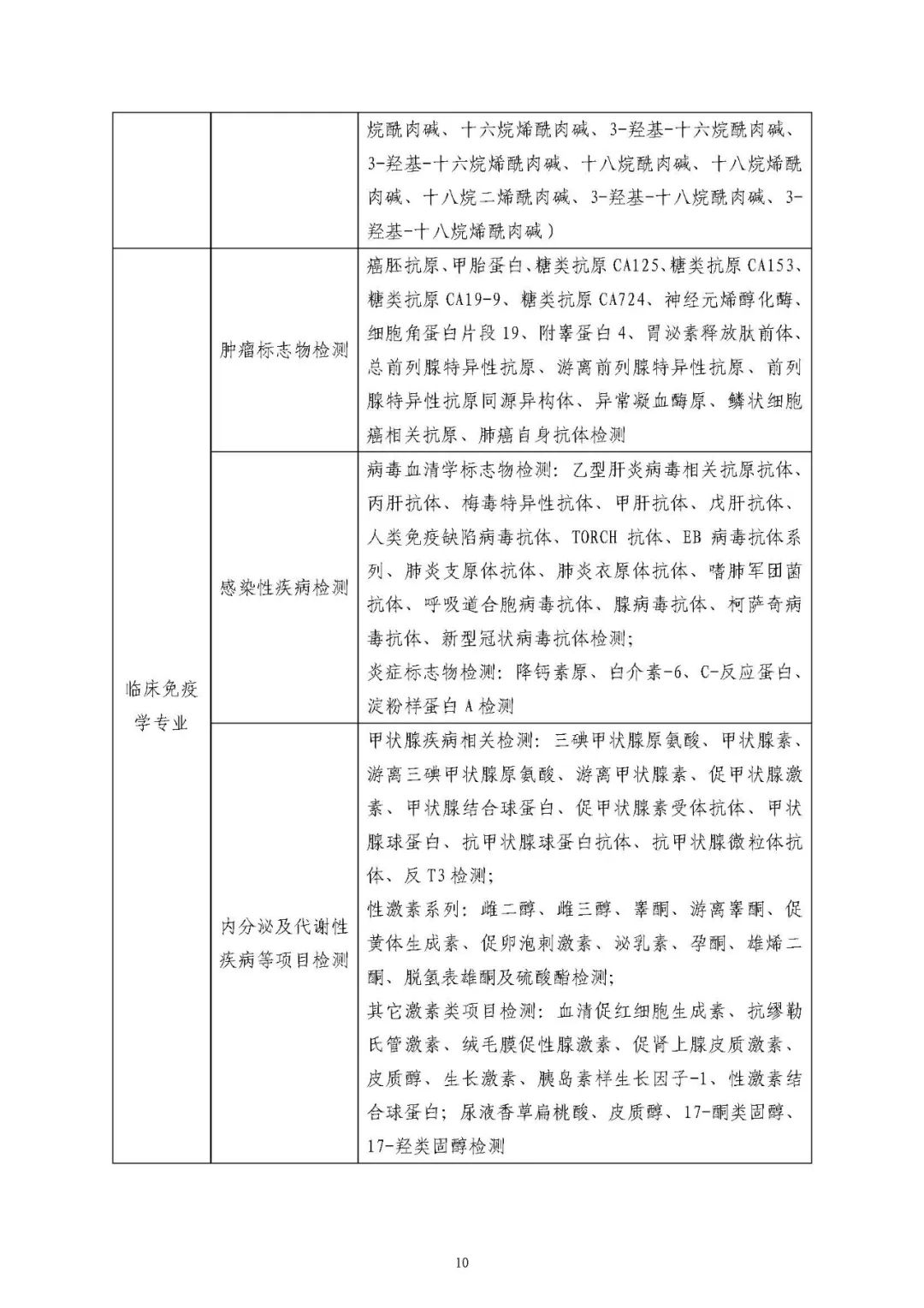 | 2022年11月,国家卫生健康委办公厅发布关于印发国家检验医学中心设置标准的通知,并制定了《国家检验医学中心设置标准》,国家检验医学中心应当具备重大疾病以及疑难病与危重症和突发传染病诊疗相关检验能力,具备辐射和指导基层检验服务能力和水平提高的能力,以及未来3年,国家检验医学中心开展的必备检验项目清单(见附表)。在必备检验项目清单中,共设置了5个专业(临床血液及体液学专业、临床生物化学专业、临床免疫学专业、临床微生物学专业、临床细胞分子遗传学检验)和26个分类。
