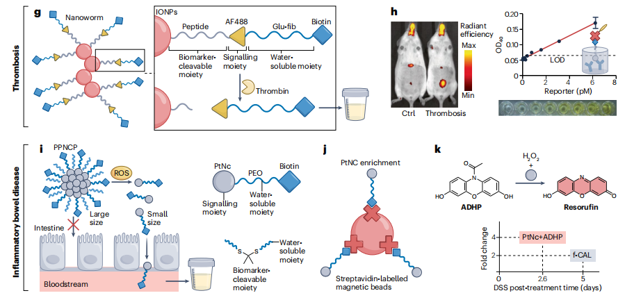 血栓形成。凝血酶是凝血级联反应中最重要的丝氨酸蛋白酶,可被凝血酶反应性纳米蠕虫检测到(图g)。这些AUBP具有可被凝血酶裂解的底物-报告串联肽,可通过ELISA或单分子ELISA检测。肺血栓小鼠静脉注射后可实现基于ELISA-based的比色分析(图h)。