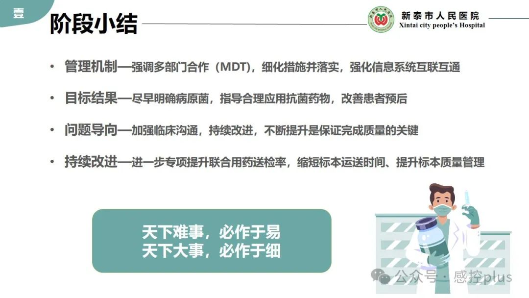 导 读: 抗菌药物治疗前病原学送检率是医院感染管理中的重要指标之一。通过合理提高抗菌药物治疗前病原学送检率,可以有效指导抗菌药物的选择和使用,提高治疗效果,减少细菌耐药性的产生,提高医疗质量和患者安全。PDCA是一种持续质量改进的管理方法,那么,如何将PDCA应用到抗菌药物治疗前病原学送检管理当中,以提高抗菌药物治疗前病原学送检率? 2024年感控plus V讲座第3讲,感控plus特邀山东省新泰市人民医院杨娜老师带来“提高住院患者抗菌药物治疗前病原学送检率PDCA”的主题讲座,希望对各位老师关于抗菌药物的管理能有所帮助和参考。分享讲者PPT: