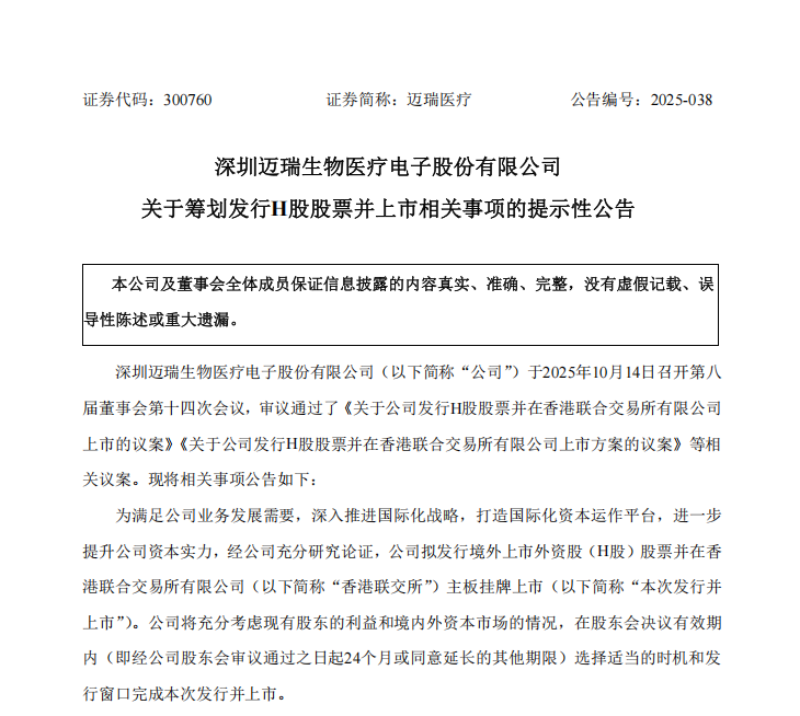 发行方案核心内容 根据公告,迈瑞医疗拟在香港联交所主板发行境外上市外资股(H股),每股面值人民币1元,发行规模不超过发行后总股本的10%(超额配售权行使前),并授予整体协调人不超过15%的超额配售权。发行方式包括香港公开发售及国际配售,定价将参考国际市场惯例及投资者需求确定。募集资金在扣除发行费用后,将用于推进国际化布局、加大研发投入及补充运营资金。 公司治理与人事调整 为满足港股上市要求,迈瑞医疗同步优化治理结构: 1. 增选独立董事:提名顾敏康为第八届董事会独立董事,其拥有丰富的法学教育与研究经验,曾任香港城市大学法律学院副院长、香港教育大学应用政策研究及教育未来学院副院长。 2. 明确董事角色:李西廷、吴昊、郭艳美为执行董事;徐航、成明和为非执行董事;独立非执行董事包括梁沪明、周先意等7人。 3. 调整专业委员会:新增许静为提名委员会委员,顾敏康为审计委员会及战略与可持续发展委员会委员。 4. 聘任联席公司秘书:由李文楣与专业机构人士黄美凤共同担任,李西廷及李文楣兼任香港联交所授权代表。 上市进程与后续安排 本次发行需经2025年第一次临时股东大会审议通过,并获中国证监会、香港证监会及香港联交所等监管机构批准。公司计划在股东大会决议有效期内(24个月)完成上市。同时,公司拟修订《公司章程》及22项治理制度,并制定《境外发行证券与上市相关保密和档案管理工作制度》,以合规应对两地监管要求。 战略意义与市场影响 迈瑞医疗作为国内医疗器械龙头企业,此次赴港上市将拓宽融资渠道,增强国际品牌影响力,为其全球化业务扩张提供资本支持。董事会表示,将严格遵循境内外法规,稳健推进上市工作,并及时披露进展。 风险提示 公司提示,本次发行仍存在未能通过监管审批或市场环境变化导至的延期风险,投资者需关注相关不确定性。 迈瑞医疗的赴港上市计划,标志着其国际化战略进入新阶段,未来有望借助双资本市场平台加速产业升级与全球资源整合。 |