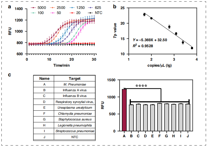 呼吸道感染(RTIs)是全球发病率和死亡率的主要诱因之一。季节性流感、肺炎支原体(MP)、SARS-CoV-2等病原体常同时流行,其临床症状重叠且难以区分,早期精准诊断对指导临床治疗和公共卫生应对至关重要。因此,迫切需要高通量、多病原体检测,通过快速识别大量患者群体中的致病病原体,减轻医院和实验室的压力。目前主流检测技术如RT-qPCR虽具高灵敏度和特异性,但依赖实验室设施。等温核酸扩增技术如环介导等温扩增(LAMP)无需热循环约束且保留高分析灵敏度,但其应用受限于引物设计复杂性及多重检测中交叉引物干扰等问题。微流控技术将样品制备、扩增与检测集成于微型自动化平台,为呼吸道病原体诊断提供了新思路。然而,现有微流控设备仍存在几个局限:(1)通量受限;(2)手动驱动或复杂离心结构;(3)系统集成度低,易导至污染。 近日,杂志Microsystems & Nanoengineering上发表了一篇题为“A fully automated rotary microfluidic platform for high-throughput multiplex detection of respiratory tract pathogens”的文章。作者开发了一种全自动旋转微流控平台(FA-RMP),用于高通量多重呼吸道病原体检测。FA-RMP能够在30分钟内并行处理16个独立的反应,支持同时检测多达4个不同的临床样品。该平台可在30分钟内检测出50拷贝/μL的肺炎支原体DNA,同时支持3种病原体的检测,为临床呼吸道病原体的多重诊断提供了一种很有前景的工具。 图片来源:Microsystems & Nanoengineering 主要内容 FA-RMP整合微流控芯片、光学检测模块及四通道温控系统,整体尺寸为340mm × 255mm × 230mm,重量小于9kg,适用于POCT场景。FA-RMP将温度控制和荧光信号检测集成到全自动工作流程中,能够同时处理多达四个单独的检测通道,从而实现高通量诊断。微流控卡盒采用旋转驱动结构,集成样本裂解、试剂混合与液体分配功能。通过电机驱动转子旋转,控制液体在裂解室、样本加载室与混合室间定向流动,最终将裂解后样本导入预装冻干LAMP试剂的反应室。FA-RMP可在~ 30min内自动完成核酸释放、等温扩增、实时荧光检测等检测过程。 全自动旋转微流控平台(FA-RMP)概述 图片来源:Microsystems & Nanoengineering 作者优化了LAMP反应内引物(FIP/BIP)、外引物(F3/B3)及环状引物浓度,最终确定了内引物20μM(图a)、外引物5μM(图b)、环状引物10μM(图c)。优化Mg2+浓度为4 mM,以平衡扩增效率与非特异性信号抑制(图d)。 LAMP反应体系优化 图片来源:Microsystems & Nanoengineering 利用MP标准培养物,作者研究了FA-RMP的敏感性和特异性。结果显示,FA-RMP对MP-DNA的检测限低至50 copies/μL(图a),在5000–50 copies/μL范围内,阈值时间(Tp)与模板浓度对数呈线性相关(R² = 0.9528),说明FA-RMP具有很好的定量能力(图b)。在8种非目标呼吸道病原体(流感A/B、呼吸道合胞病毒等)检测中均无交叉反应,证明其具有高特异性(图c)。 FA-RMP敏感性、特异性研究 图片来源:Microsystems & Nanoengineering 通过甲型流感、乙型流感和肺炎支原体(MP)的临床样本,作者评估了该系统同时检测多种呼吸道病原体的能力。临床样品经核酸释放试剂预处理后加入微流控卡盒。结果显示,已知的甲型流感、乙型流感和MP样本都在适当的腔室中特异性检测,没有交叉信号(如下图)。这证明了该分析对临床标本的适用性及其在芯片上多重目标的能力。 病原体的多重检测 图片来源:Microsystems & Nanoengineering 作者开发了一种全自动旋转微流控平台(FA-RMP),用于高通量多重呼吸道病原体检测。FA-RMP通过微流控技术、冻干试剂与自动化系统的融合,实现了呼吸道病原体的高通量、快速以及多重检测。FA-RMP具有30分钟内完成4样本并行检测的能力,可达到50 copies/μL的检测限与100%特异性,适用于资源有限环境中多重呼吸道病原体的同步筛查需求。 但尽管FA-RMP在鼻咽拭子检测中表现优异,但对高粘度样本(如痰液)的适用性尚未验证。未来需扩展复杂样本类型测试,并进一步增加临床样本规模及病原体覆盖范围。同时,平台实时荧光采集与模块化腔室结构为未来集成定量分析及数字LAMP提供基础。通过结合多重等温扩增方法与其他病原体引物,可进一步扩展其应用场景。 |