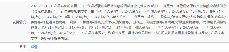 | 最近呼吸道圈子里又开始热闹起来了,起因是江苏宏微特斯对自己刚拿证不久的呼吸道六联检换了个名字和规格。由“六项呼吸道病原体核酸检测试剂盒(荧光PCR法)”变更为“呼吸道病原体多重核酸检测试剂盒(荧光PCR法)”由“I型(1人份/包):24人份/盒; I型(8人份/包):24人份/盒、48人份/盒; II型(1人份/包):24人份/盒; II型(2人份/包):24人份/盒、48人份/盒。”变更为“规格一:腺病毒/肺炎支原体/人偏肺病毒/副流感病毒/鼻病毒/呼吸道合胞病毒。(六联检) 规格二:腺病毒/肺炎支原体/人偏肺病毒(三联检)。 规格三:副流感病毒/鼻病毒/呼吸道合胞病毒(三联检)。 每种包装规格均包含: I型(1人份/包):24人份/盒; I型(8人份/包):24人份/盒、48人份/盒; II型(1人份/包):24人份/盒; II型(2人份/包):24人份/盒、48人份/盒。”得,这分管设计的产品,优势体现出来了,直接按管来买,换个包装规格,产品不仅合规,灵活性也上来了。无独有偶,万泰生物刚刚拿证的呼吸道九联检,也同样做了拆管变更。由“九项呼吸道病原体核酸检测试剂盒(PCR-荧光探针法)”变更为“多项呼吸道病原体核酸检测试剂盒(PCR-荧光探针法)”。规格1:甲型流感病毒/乙型流感病毒/呼吸道合胞病毒/副流感病毒/呼吸道腺病毒/肺炎支原体/人偏肺病毒/人鼻病毒/博卡病毒;(九联检)规格2:甲型流感病毒/乙型流感病毒/呼吸道合胞病毒/副流感病毒/呼吸道腺病毒/肺炎支原体;(六联检)规格3:甲型流感病毒/乙型流感病毒/呼吸道合胞病毒/人偏肺病毒/人鼻病毒/博卡病毒;(六联检)规格4:副流感病毒/呼吸道腺病毒/肺炎支原体/人偏肺病毒/人鼻病毒/博卡病毒;(六联检)规格5:甲型流感病毒/乙型流感病毒/呼吸道合胞病毒;(三联检)规格6:副流感病毒/呼吸道腺病毒/肺炎支原体;(三联检)规格7:人偏肺病毒/人鼻病毒/博卡病毒;(三联检)万泰这个变更,绝绝子,一个九联检,硬生生的拆成了7个产品!一变七。在套餐解绑的大背景下,大多重呼吸道联检产品拆管是无奈之选,当时设计产品的时候,还嫌弃管多了麻烦,没想到,最后竟然成了优势。这也是呼吸道联检企业在当下环境下,能够做出的有效应对策略之一,但只是改变个规格,仍旧使用同一张注册证,未来在价格控制方面,难度还是有的。