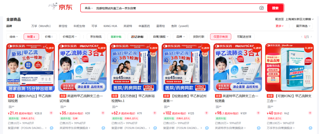 3. 季节性爆发带来的超额利润 流感市场的特殊性在于其季节性爆发的特点。在流感高峰期,市场需求会瞬间激增数倍,导至供不应求。此时,企业议价能力最强,往往能获得超额利润。对于生产企业而言,如何平衡产能和库存是关键,而成功押注爆发季的企业将收获颇丰。 市场利润并非空穴来风,真实的电商销售数据印证了消费者和市场对多重联检试剂的巨大需求。小编截取了2025年12月亚马逊美国站“流感 A&B 检测盒”的搜索结果页面,可以清晰地看到几个核心趋势:
