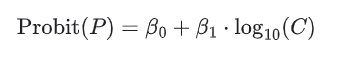 X = log10(C),Y=Probit 值 计算 β1:=斜率SLOPE(Y列, X列)≈ 2.78 计算 β0:=截距INTERCEPT(Y列, X列)≈ -2.53
