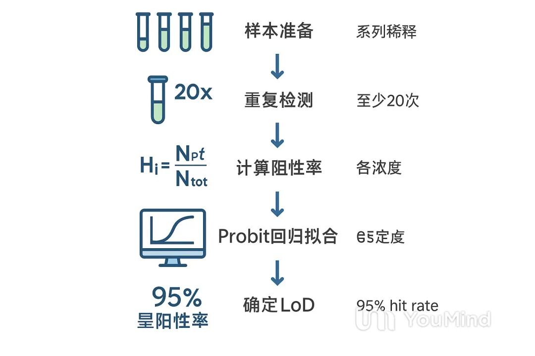 一、 核心概念1. 什么是 Probit 方法?Probit 方法(概率单位法)是一种统计回归分析技术,专门用于处理二项分布数据。在核酸检测性能评估中,它通过建立被测物浓度与检出概率(阳性阳性率)之间的函数关系,来推断出特定检出概率下的浓度阈值。 对于分子测量程序,当样本浓度极低时,结果往往不是连续的数值,而是“有”或“无”。因此,我们无法计算标准差,而是通过阳性率(Hit Rate)来衡量检测能力。 2. 关键术语定义根据 CLSI EP17-A2 标准,以下术语至关重要: 空白限 (Limit of Blank, LoB): 对于大多数分子测量程序,阴性样本的测量结果通常报告为“未检出”或零拷贝。因此,在 Probit 评估中,LoB 通常被设定为零。