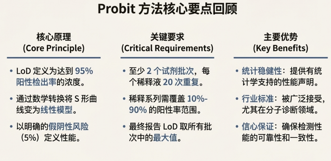 得到方程:Y = 2.78 X-2.53 计算 95% LoD,我们要找出 95% 阳性率(即 Probit 值 Y = 1.645)对应的浓度。代入方程:1.645 = 2.78log10(LoD) - 2.53LoD = 10^1.50 ≈31.75 copies/mL3.3 结果解释与报告小结 精确定义检测限(LoD)不仅仅是一个技术要求,它是确保诊断结果可靠性的基石。Probit方法提供了一个强大、标准化的框架,使我们能够以科学的严谨性和统计学的确定性,来证明和沟通我们检测能力的真实极限。