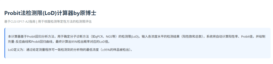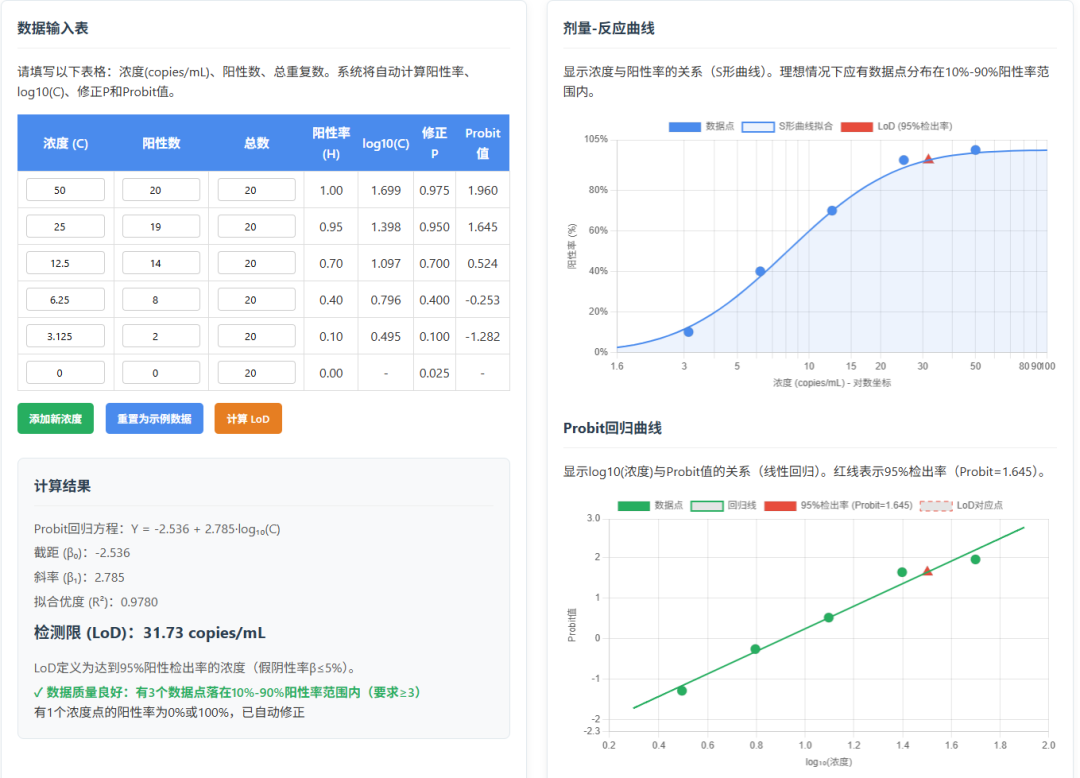 LOD还需要密切与使用用途相结合。合适的才是最好的。比如现在正是流感刚发的季节,你知道了流感的高流行率,身边有人中招了,你隐隐感觉自己不舒服了。这个时候你需要一个LOD很低的试剂吗?纯靠抛硬币也会很准。当检测与贝叶斯相遇:检测判阴阳,贝叶斯辩真伪 对于检测来说,未来不应还是一次次独立的检测结果,而是会在流行病学大数据和人工智能的加持下变得更加准确和贴近实际。 CLSI EP17-A2 Evaluation of Detection Capability for Clinical Laboratory Measurement Procedures; Approved Guideline—Second Edition 制作了一个probit法计算最低检测限(LOD)的计算器,输入浓度、阳性数和总数就可以自动计算LOD并且绘制出剂量-反应曲线和probit回归曲线。大家可以用我的文章作为附件上传,让大语言模型生成一下。成功了记得打赏哦。