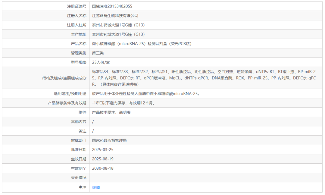 miRNA作为一类长度约18-25nt的非编码RNA,已成为精准诊断的理想分子标志物。miRNA的诊断价值集中体现为“无创性、高灵敏度、高特异性”,可覆盖肿瘤、感染性疾病、神经退行性疾病等多领域,弥补传统诊断手段的短板,实现疾病的早期识别与精准确诊。 miRNA在诊断与分型中的临床应用,依赖于精准的检测技术,目前主流技术包括荧光RT-PCR、数字PCR。其中荧光RT-PCR技术成熟、成本可控,广泛应用于临床常规检测(如晋百慧、命码生物的获证试剂盒)。数字PCR技术灵敏度更高,适用于低丰度miRNA检测(小海龟、新弈等企业)。 本文梳理了截至26年1月,在中国已获NMPA医疗器械注册证的miRNA试剂盒开发企业情况(Ⅲ类为主)。企业名称 | 产品名称 | 注册证号 | 获批时间 | 核心用途 | 技术路线 | 顿慧医疗(原上海骏实生物) | 7种微小核糖核酸检测试剂盒(PCR荧光探针法) | 国械注准20173403299 | 2022-02-09 | 肝细胞癌早诊与疗效监测 | 荧光RT-PCR | 江苏命码生物 | 微小核糖核酸(microRNA - 25)检测试剂盒(荧光PCR法) | 国械注准20153402055 | 2025-03-25 | 胰腺癌辅助诊断 | 荧光RT-PCR | 深圳市晋百慧生物 | miR - 92a检测试剂盒(荧光RT - PCR法) | 国械注准20183400108 | 2022-08-03 | 结直肠癌筛查 | 荧光RT-PCR | 康德(深圳)生物 | 4种微小核糖核酸检测试剂盒(PCR荧光探针法) | 国械注准20253401406 | 2025-07-17 | 疑似胰腺癌患者辅助诊断 | 荧光RT-PCR | 觅瑞(杭州)生物 | 12种微小核糖核酸(microRNA)检测试剂盒(荧光RT-PCR法) | 国械注准20253401959 | 2025-11-12 | 胃癌早筛(国内首个) | 核荧光RT-PCR |
