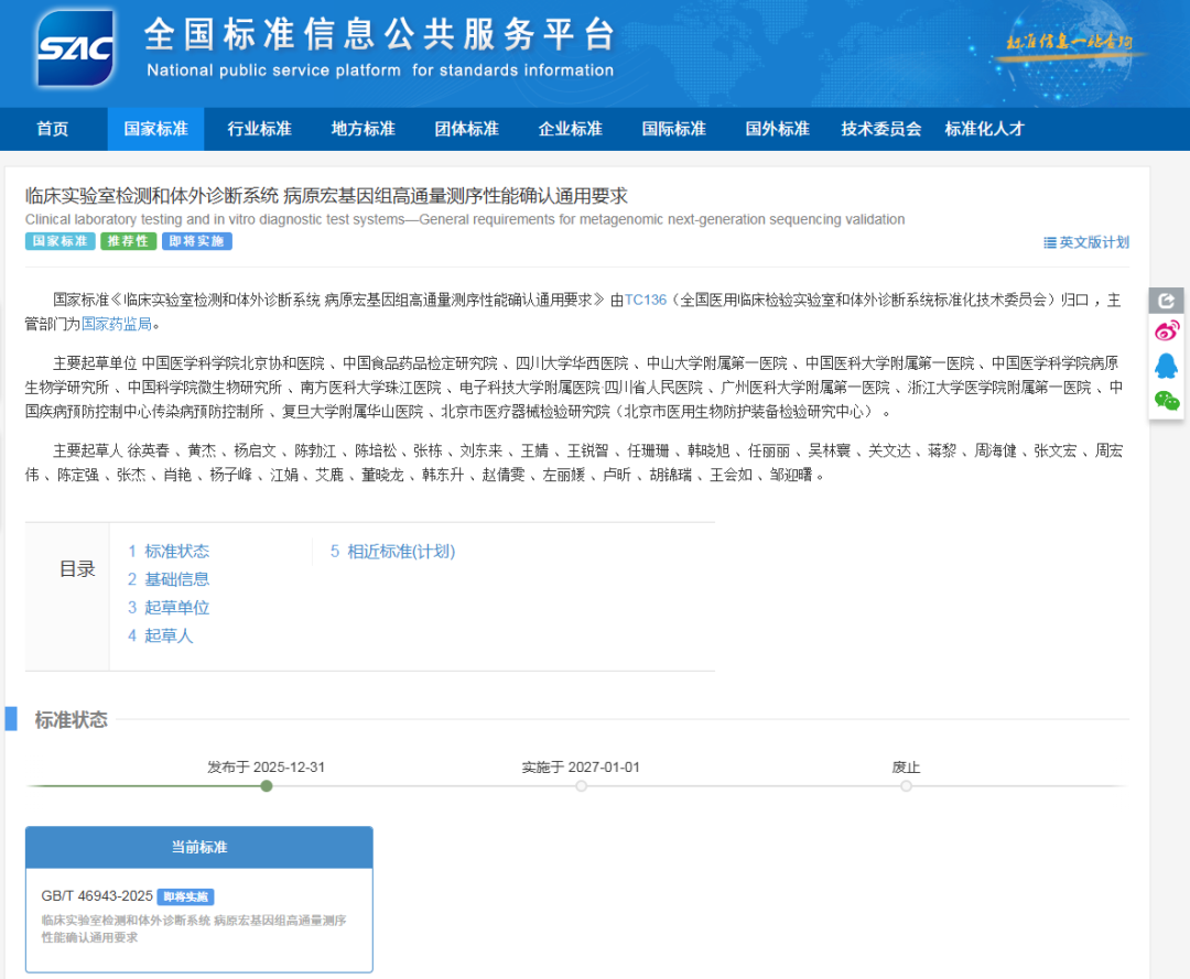 2025年12月31日,国家标准《临床实验室检测和体外诊断系统病原宏基因组高通量测序性能确认通用要求(GB/T46943—2025)》正式发布。该标准将于2027年1月1日起正式实施。