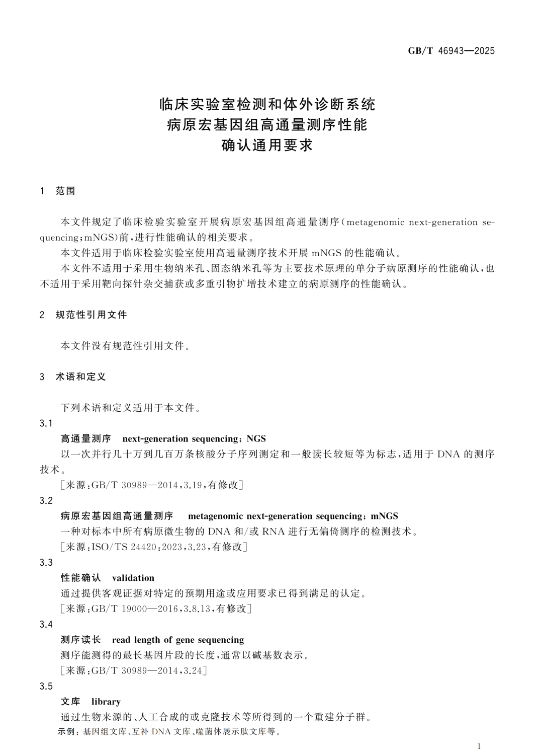 以下附《临床实验室检测和体外诊断系统病原宏基因组高通量测序性能确认通用要求(GB/T46943—2025)》原文: