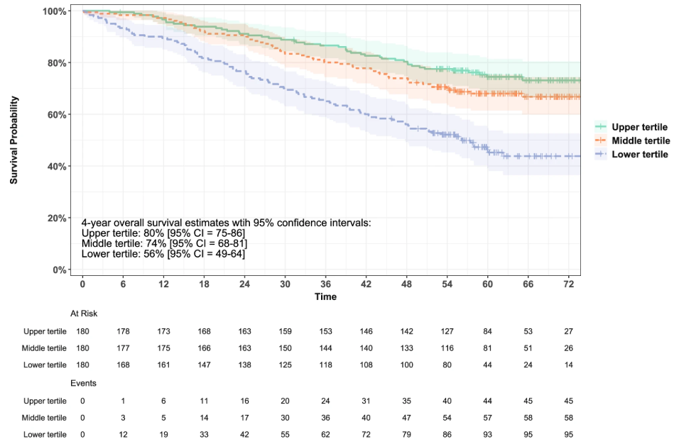 作者将患者按模型预测风险分组后,长期生存结局(OS)呈现显著差异。在内部验证队列中,按预测概率分位数分层的患者 4 年 OS总生存率分别为 71%、61%和47%;外部验证队列中,分别为 80%、74%和 56% (如下图)。与上三分位组相比,中、下三分位组患者的死亡风险显著增加。这证实了模型预测的早期PSA应答概率具有重要的长期预后价值。