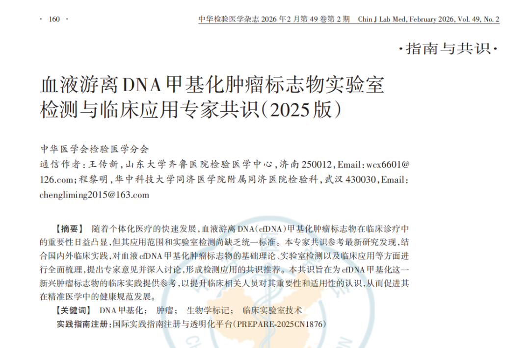 【摘要】 随着个体化医疗的快速发展,血液游离 DNA(cfDNA)甲基化肿瘤标志物在临床诊疗中的重要性日益凸显,但其应用范围和实验室检测尚缺乏统一标准 。本专家共识参考最新研究发现,结合国内外临床实践,对血液 cfDNA 甲基化肿瘤标志物的基础理论、实验室检测以及临床应用等方面进行全面梳理,提出专家意见并深入讨论,形成检测应用的共识推荐 。本共识旨在为 cfDNA 甲基化这一新兴肿瘤标志物的临床实践提供参考,以提升临床相关人员对其重要性和适用性的认识,从而促进其在精准医学中的健康规范发展。 【关键词】 DNA 甲基化 ; 肿瘤 ; 生物学标记 ; 临床实验室技术 DNA 甲基化作为一种表观遗传调控机制,在基因表达调控中发挥重要作用,同时也是肿瘤发生发展的重要分子标志[1‑2]。肿瘤 DNA 甲基化标志物在肿瘤筛查、辅助诊断及预后评估等临床实践中展现出应用潜力 。随着液体活检的快速发展,采用体液分析个体的癌症分子特征成为热点 。血液标本取样便捷、存储方便,能够相对广泛地反映身体的生理病理状况,是临床检验应用最为广泛的标本类型。 基于血液游离 DNA(circulating free DNA, cfDNA)甲基化的肿瘤标志物,因其具有高灵敏性、非侵入性、可溯源、可动态监测等优势,在液体活检领域展现出广阔的应用前景[3]。 目前国内外针对血液 cfDNA 甲基化肿瘤标志物检测,尚未形成统一的临床应用规范与标准化检测体系,这在一定程度上制约了该技术在临床场景中的规范化推广与应用。 为提高临床对血液 cfDNA甲基化检测重要性的认识,促进该领域的标准化发展,中华医学会检验医学分会基于最新的研究发现和临床实践编写了本专家共识。该共识系统介绍血液cfDNA甲基化肿瘤标志物的基本概念、实验室检测技术以及临床应用等内容。由于目前已获得我国国家药品监督管理局(NationalMedical Products Administration,NMPA)批准的血液cfDNA甲基化标志物均基于聚合酶链反应(polymerasechainreaction,PCR)检测方法,故本共识的核心内容主要聚焦于基于PCR的cfDNA甲基化实验室检测。本共识旨在为临床医生及检测人员提供关于血液cfDNA甲基化肿瘤标志物检测及其临床应用的指导性建议,促进临床检测规范化,为肿瘤筛查、辅助诊断以及预后评估等临床应用提供依据。
