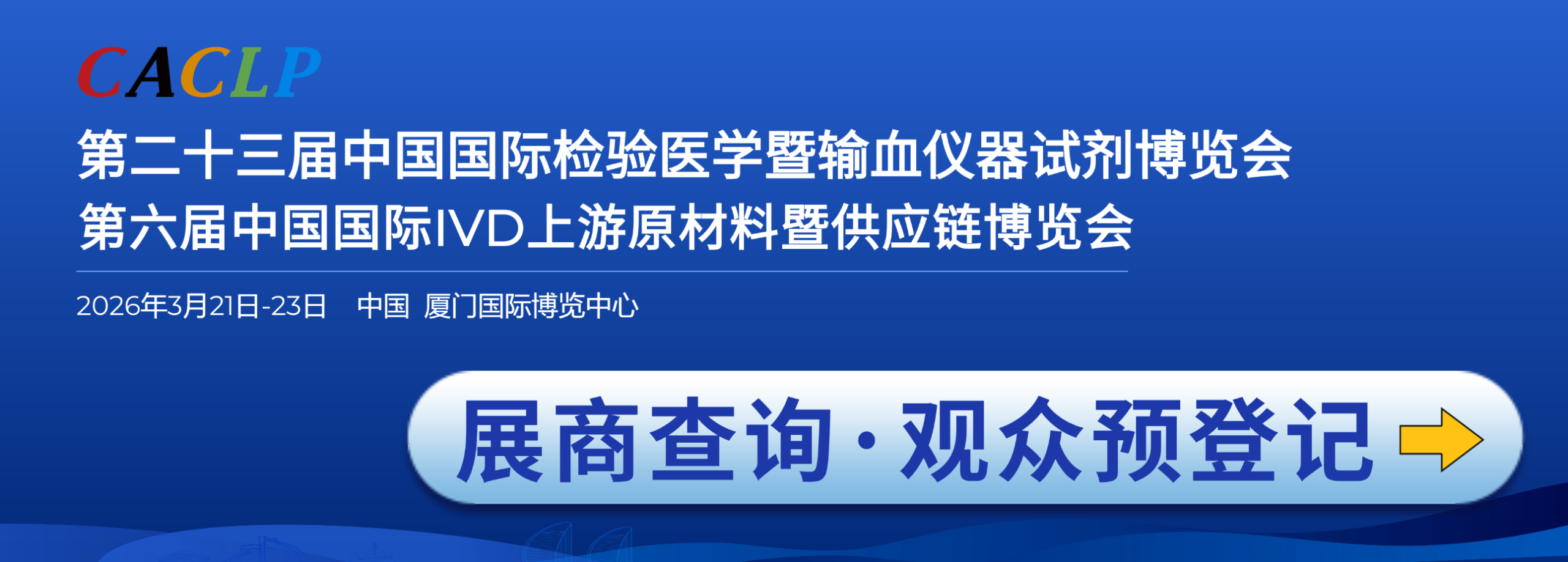 由智奥瑞和(上海)展览有限公司主办的第二十三届中国国际检验医学暨输血仪器试剂博览会、第六届中国国际IVD上游原材料暨供应链博览会(CACLP)将于2026年3月21日至23日在厦门国际博览中心隆重举行。届时,多场前沿论坛及企业自办会也将同期举办。