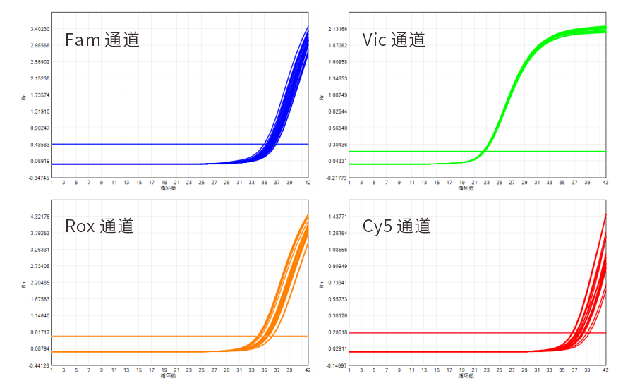 MD2104-X体系在呼吸道引探中扩增效率表现良好,各通道扩增效率均在95-105%之间,R2系数均在0.998-0.999。