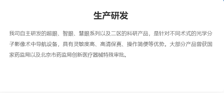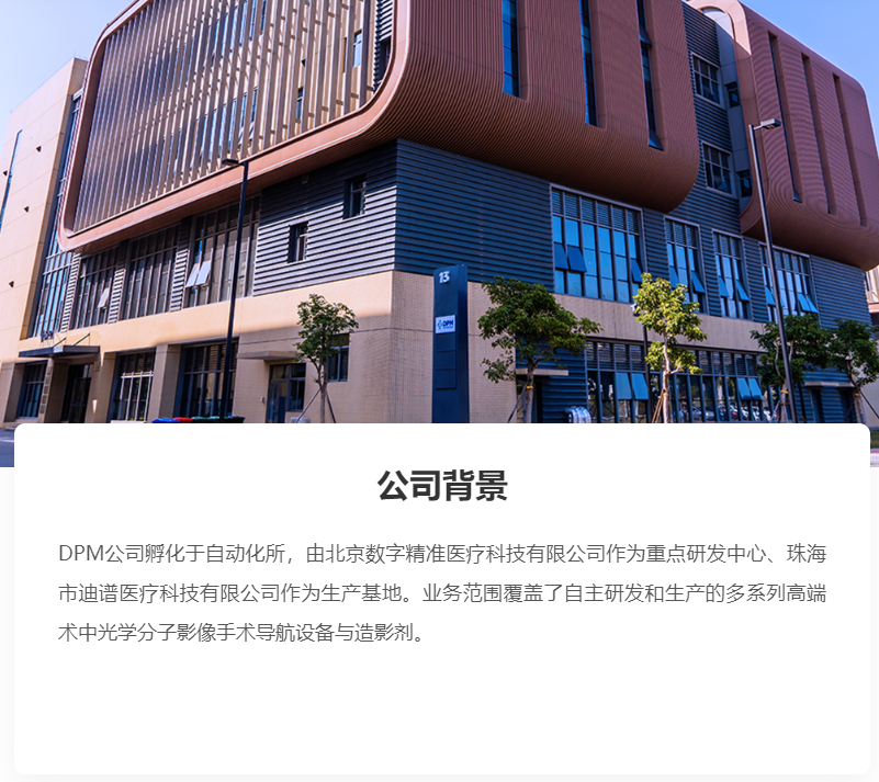 DPM公司孵化于自动化所,由北京数字精准医疗科技有限公司作为重点研发中心、珠海市迪谱医疗科技有限公司作为生产基地。业务范围覆盖了自主研发和生产的多系列高端术中光学分子影像手术导航设备与造影剂。