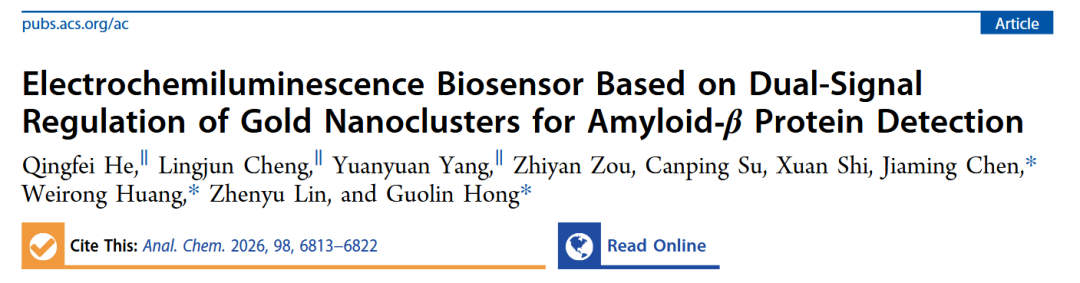 近日,厦门大学一项科研成果发表在Anal. Chem.上,该研究构建了一种新型电化学发光(ECL)生物传感器,通过谷胱甘肽(GSH)和过氧化氢(H₂O₂)对金纳米簇(AuNCs)进行双重信号调控,实现了对阿尔茨海默病(AD)血液标志物Aβ40蛋白的高灵敏度检测。