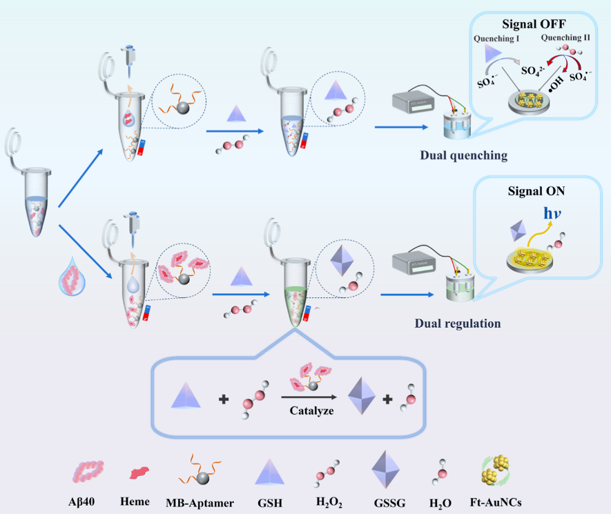 研究创新性地提出“双重猝灭—催化恢复”机制。利用Aβ40与血红素形成的复合物具有过氧化物酶样活性,可催化GSH与H₂O₂发生氧化还原反应,使两者相互消耗,从而解除对AuNCs-ECL信号的猝灭作用,实现信号“关-开”切换。