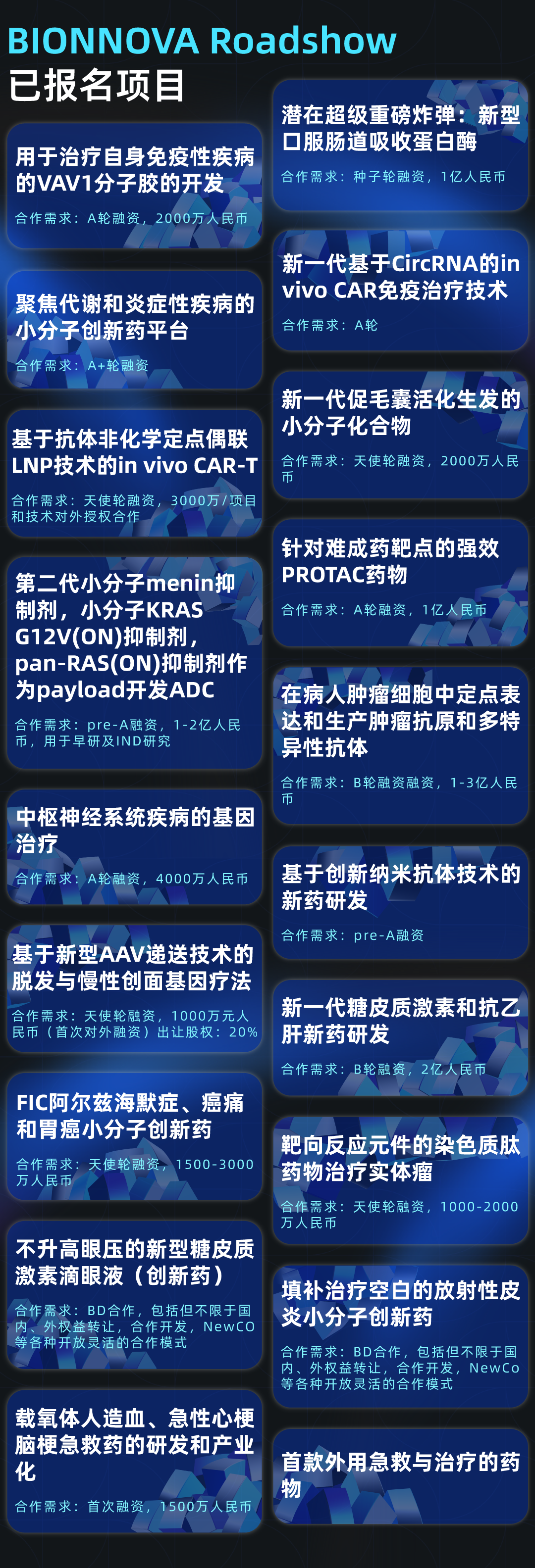 第七届BIONNOVA生物医药创新者论坛暨展览会将于4月22–23日在上海张江科学会堂举办。目前大会筹备进展持续推进:230+讲者确认参与、200+展台陆续入驻、29场分论坛议程成型、预计10000+产业从业者齐聚现场。 大会获得多家头部企业的支持,包括辉瑞、石药集团、复星医药、罗氏、中国生物制药、上海医药、东阳光药、哈药集团、先声药业、君实生物、亘喜生物、微芯生物等产业重要力量共同参与,为大会提供坚实的产业基础。 大会展区规模也进一步扩大,200+展商将在现场集中展示创新技术、研发服务与产业解决方案,覆盖CRO/CDMO、实验设备、试剂耗材、制药工程、递送与包装、AI与数字化等多个关键环节,在张江这一中国生物医药创新高地,形成一个高密度、高互动的产业交流场域。 扫码报名第七届BIONNOVA生物医药 创新者论坛暨展览会 (BIONNOVA LEADERS FORUM & EXPO 2026 从战略决策层到一线实践者 230+产业核心讲者集结 阵容决定高度 角色决定深度 经验决定价值 决策者与实践者同台开讲 本届大会已确认230+讲者加入,覆盖跨国药企、国内外药企、Biotech高管、创始人、全球开发负责人及核心技术负责人、头部CRO/CDMO管理层及技术专家、科研院所研究学者、临床研究负责人以及投资决策人等产业实践者。他们代表行业领先水平,直接参与真实项目的立项评估、早期发现、临床前研究、临床推进、工艺放大与全球注册路径设计等环节。 这里不仅讨论宏观趋势,还有具体实践经验与方法论,决策者与执行者同台,构建一个能够真正对接产业核心问题与资源的高密度交流场域。 (BIONNOVA LEADERS FORUM & EXPO 2026 让创新更快成为现实 29场论坛全链路布局 结构决定效率 协同决定上限 全链路决定竞争力 系统能力,在这里完整呈现 (BIONNOVA LEADERS FORUM & EXPO 2026 BIONNOVA定制专题研讨会 关键嘉宾 专属内容 一次到位 BIONNOVA围绕具体议题,联合具备相关实践经验的企业或研究机构,策划并组织定向专题研讨会。每一场研讨均聚焦精准方向,例如ADC、DMPK、药包材、In vivo CAR-T、BD合作、CMC技术等产业发展中的关键议题,以合作企业或机构的实践经验为核心,确保内容紧贴产业需求。 面向2026年,BIONNOVA将进一步完善定向研讨机制,面向更多关键议题,邀请具备一线经验的同仁参与交流。通过集中讨论、路径对比与经验复盘,提供更具参考价值的行业经验。 (BIONNOVA LEADERS FORUM & EXPO 2026 聚焦真实需求 路演项目首次剧透 项目需要舞台 资本需要判断 对话,往往是合作的开始 本届BIONNOVA投融资项目路演环节将聚焦具有差异化技术路径和明确临床价值的创新项目,通过项目展示、现场交流与评委打分的形式,搭建项目与资方之间的高效沟通桥梁。围绕技术创新、研发进展、临床规划与商业化路径,与投资人展开面对面的交流与反馈,在真实产业语境下推动项目价值被看见、被理解,并进一步探索潜在合作与投资机会。 4月22–23日,与创新者同行,与产业核心参与者同场交流,共同洞察下一阶段创新方向。 (参会——扫文中二维码进行报名) |