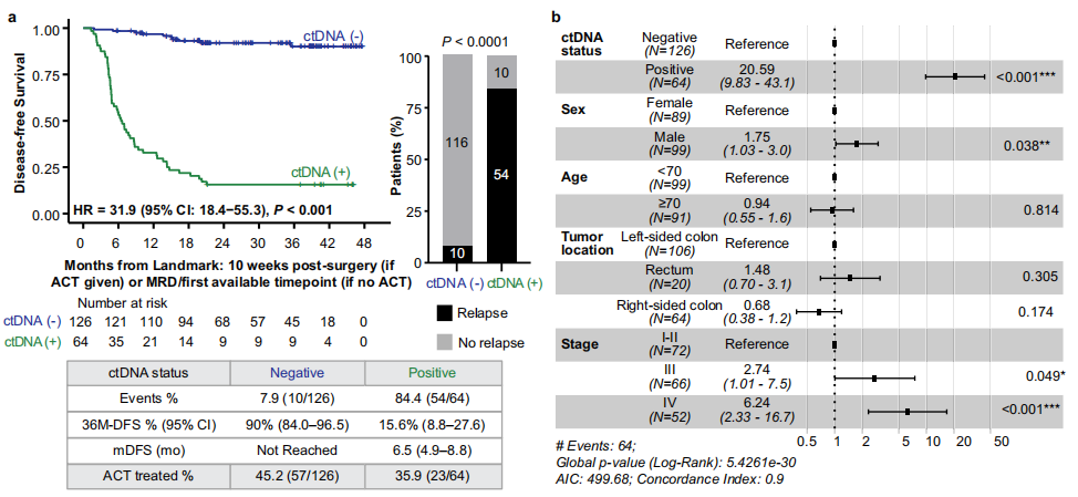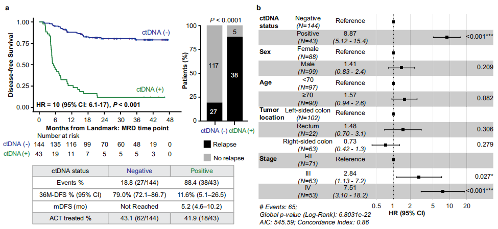 微小残留病灶(MRD)窗口期指的是术后2-10周直至辅助化疗(ACT)开始前。分析结果显示,在MRD窗口期ctDNA阳性是复发风险极高的预测指标。在187名患者中,ctDNA阳性率为23%(43/187)。其中,88.4%的ctDNA阳性患者经历了复发,而ctDNA阴性患者的复发率仅为18.8% (下图a)。这意味着ctDNA阳性患者的复发风险是阴性患者的10倍,其3年无病生存率仅为11.6%,远低于阴性患者的79%。在未接受辅助化疗的患者中,该检测的特异性达到了100%。为了进一步评估ctDNA的预后价值,作者还进行了多变量分析。结果显示,ctDNA 阳性是与较短DFS相关的最重要预后因素(风险比:8.87)(图 b),其次是病理分期的增加。