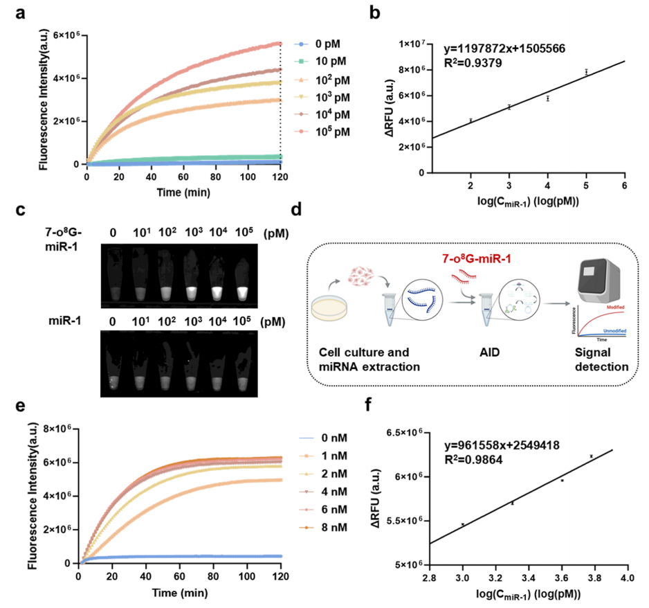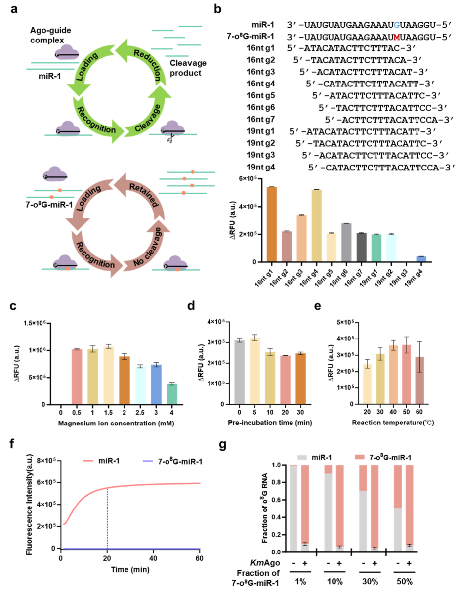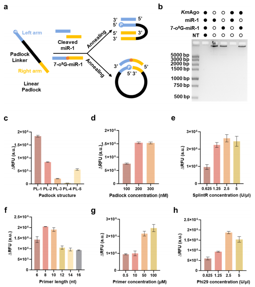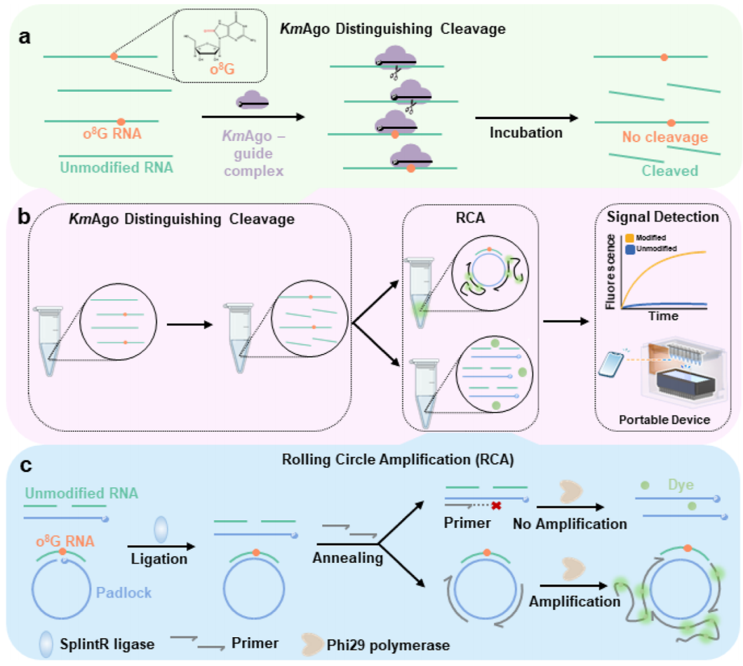 核心突破:首次引入Ago,建立修饰miRNA检测新范式 过去,检测RNA氧化修饰往往依赖昂贵的测序仪或复杂的抗体技术,不仅效率低且难以普及。 刘倩团队的创新在于:他们发现并利用了Ago蛋白对修饰RNA独特的识别机制。 首创性应用:首次将Ago蛋白用于对miRNA中的氧化修饰进行位点特异性精准定位。 精准区分:利用Ago蛋白的特性,当它遇到正常的RNA时会高效剪切;而一旦遇到带有O8G修饰的位点,它便会选择性富集,从而高效提高修饰miRNA的丰度(图2)。 高分辨率与超灵敏度:结合滚环扩增(RCA)技术(图3),该系统实现了单碱基级别的分辨率和皮摩尔(pM)级别的超高灵敏度。这意味着,即使样本中只有极少量的氧化修饰,也将被精准检测(图4)。