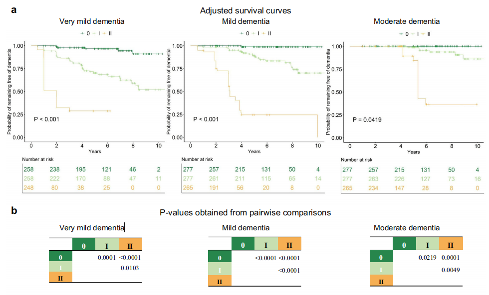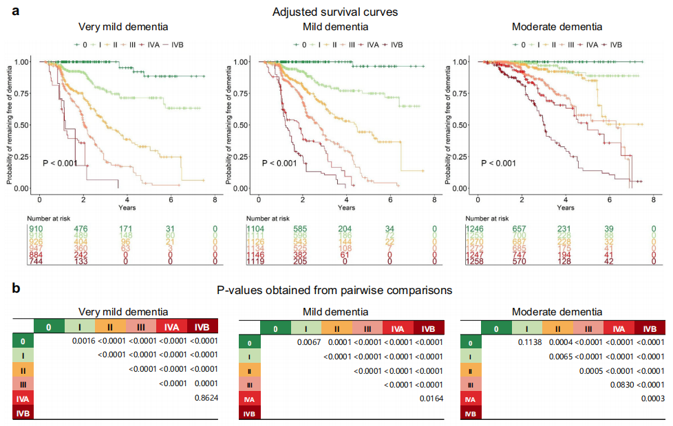 在MCI阶段,海马体积(HV)和 pTau217成为最重要的预后指标,反映了此阶段神经退行性萎缩成为主导进程(如下图b)。海马体积较大且pTau217较低者(M1)风险最低;海马体积较大但pTau217较高者,或海马体积较小但GFAP较低者(M2)为中等风险;海马体积较小且GFAP升高者(M3)为风险最高。