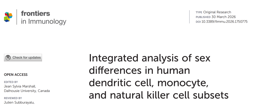Yang, Y., Chen, L., Shang, M., et al. (2026). Integrated analysis of sex differences in human dendritic cell, monocyte, and natural killer cell subsets. Front. Immunol. 17:1750775.