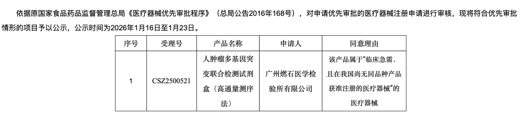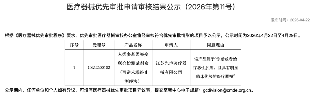 京圈的京,是南京的京” “皇冠上的明珠,被两波人同时盯上了”肿瘤NGS大panel,指的是一个注册证上“有一级变异”、“可报告二级变异”、且“技术要求中包含三级变异”的肿瘤NGS试剂盒。这就是大panel的定义,这个定义如果不小心伤害到了谁,现在关掉这篇文章还来得及。正因为这个苛刻的定义,大panel从一开始就被视为肿瘤NGS注册的珠穆朗玛峰。PS:这篇仅代表个人观点。如果我俩理解不一样,那么你是对的。欢迎留言区探讨。昨天,CMDE公示了2026年第十一批“医疗器械优先审批申请审核结果”。先声诊断的“人类多基因联合检测试剂盒(可逆末端终止测序法)”上榜!跟我们这个赛道有关系的是「(一)2、(一)5、(二)」这三条。「(一)5」一般属于“之前没有被注册过的、新的伴随诊断变异”,是一个first in class。比如年初进入优先审批通道的燃石乳腺癌CDx(PIK3CA/PTEN/AKT1)和吉因加胆管癌CDx(FGFR 1/2/3)。「(一)2」则属于“虽然没有新的伴随诊断变异”,但是在产品形态或者排列组合上玩出了新花样,是一个me better。先声诊断这次进入优先审批的就是个大panel,100%确定。但亲戚和克隆是两码事,美帝的Kit和东大的Kit也可能并不一样,所以:1. 下证的版本会有500+基因吗(一级+二级+三级)?2. CDx label能超过2个吗?会是泛实体瘤吗?这个感觉有难度,NTRK 1/2/3被世和几乎垄断了5. 会有TMB吗?如果有的话,会是一级变异还是二级变异?这可能取决于KN035那个TMB-H适应症能否获批。“医疗器械优先审批程序”和“创新医疗器械特别审查程序”,有什么差异?创新审查程序重在“全程辅导”,就像大家出去玩时找的陪玩。代表产品还没递交注册申请,对于某些挑战特别大的品种,甚至可能注册临床试验的方案都还没定。优先审批程序则是“加速通道”,就像很多景点的VIP专属通道。代表产品的注册临床试验已经做完了,正式递交了注册申请。历史的经验显示,进入优先审批程序后,拿证的周期大约在12-18个月。先声好事将近,谁最着急?每次聊NGS大panel的话题,我在世和的朋友们就会表示不开心。在世和眼里,自己的TMB是基于检测425个基因算出来的,这就是个大panel。在我眼里,一个没有一级变异、没有二级变异的试剂盒, 连个正经小panel都不算。先声已经拿到了优先审批,到时候下证了肯定会疯狂宣传“真正的NGS大panel第一证”,那可就太难受了。世和,迫切的想要保卫住自己的“大panel第一证”名号。而保卫的最好办法,就是把它真正的变成大panel。本来我是不知道的,直到昨天晚上,我梦到了一只狐狸。它说我早八辈子在雪山上救了它,现在它来还愿,让我说出一个愿望。我说我想知道世和有没有在尝试扩展TMB试剂盒的预期用途。世和已经/计划启动临床试验,目标是对获批的“非小细胞肺癌组织TMB检测试剂盒”的预期用途进行变更。一级变异:肺癌增加ALK/MET/EGFR,肠癌增加KRAS,胃癌/乳腺癌增加ERBB2扩增,泛实体瘤增加NTRK1/2/3。二级变异:肺癌14个、肠癌12个、胃癌9个、乳腺癌11个、泛实体瘤4个。如果去看历史上出台的审评指导原则,它们都有一个共性:而他们探路的过程,会被总结成经验,成为审评指导原则。所以大家觉得京圈双雄谁能率先拿到真正的大panel第一证?(选偷家的朋友们,留言区说说谁偷家?)