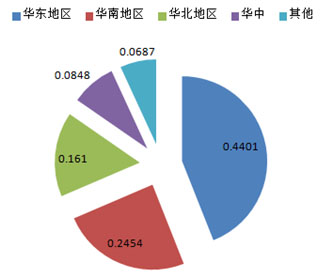 2015年全国医疗器械类销售额排名前10的省区 医疗器械企业大多集中在华东、华南和华北地区,44%的企业集中在华东地区