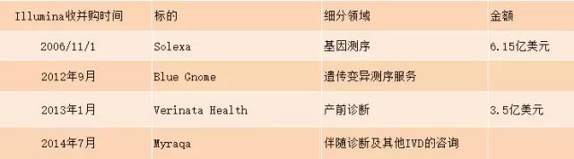 2016下半年IVD市场相当热闹,先是8月赛默飞欲出价300亿美元收购测序巨头Illumina;9月丹纳赫收购Cepheid;后是10月罗氏诊断宣布完成对kapaNGS系列产品的全面整合;11月西门子收购Conworx,再到12月初,雅培宣布终止收购美艾利尔。体外诊断市场为何动作颇多?IVD四大巨头现状又如何? 根据Boston Biomedical Consultants,inc的预计,全球体外诊断(IVD)市场2019年将达到689亿美元;EvaluateMedTech在去年年底统计预测,2020年全球医疗器械市场将达4775亿美元,而IVD销售额有望达到美元673亿美元(占13%),2015-2020年间的复合年均增长率将达6.1%,高于同期医械行业整体5%的增速。不管是哪一方的数据,IVD都无疑是资本撕咬相争的领地。 体外诊断分类浅析 体外诊断(IVD)业务主要分为体外诊断试剂、体外诊断仪器和耗材。而在中国的IVD市场,试剂业务约占市场总份额的80%。 IVD细分领域众多,根据使用环境和操作者的不同可分为临床实验室诊断和即时诊断(POCT);而根据检测指标、标本、原理的不同,IVD市场的“三国”为生化诊断、免疫诊断和分子诊断。 生化诊断起步较早,为临床最常见的传统检查,主要有测定酶类、脂类、蛋白和非蛋白氮类等几大类检测项目,其技术壁垒较低。全自动生化分析仪操作简便、检测速度快、精密度高、重复性好、检测结果不受操作影响,是生化检测发展的方向。 免疫诊断通过抗原抗体特异性结合实现检测,其试剂种类多,目前的主流技术为酶联免疫和化学发光技术。其中化学发光技术自动化程度高,正逐步取代酶联免疫,而化学发光技术壁垒较高,仪器和试剂须配套使用,因此目前国内高端市场仍由外企占据。中低端市场和有仪器换新需求的医院或成为国内厂商的突破口。 分子诊断是IVD 行业中增长速度最快的子行业(增速14%),主要包含的技术有核酸扩增技术(PCR)、原位杂交技术(ISH)、基因测序、基因芯片。 国内分子诊断起步较晚,由于其仪器研发难度高,主要核心技术受国外专利保护,因此国内市场基本由外企垄断。而试剂市场则因价格优势明显(比如PCR试剂)等因素,目前仍以国内企业为主。 POCT(point-of-care testing)指在病人旁边进行的临床检测,通常不一定是临床检验人员进行。与其他体外诊断产品相比,POCT产品缩短了从样本采集、检测到报告的检测周期,操作者没有特殊限定,甚至可以是被检测对象。目前POCT的相应技术已渗透到生化诊断、免疫诊断、分子诊断等细分领域。 IVD四巨头(ARDS)并购史及最新财报 罗氏: 罗氏在诊断领域最开始的布局即收购Cetus,而自收购Boehringer Mannheim Gmb H公司后便一发不可收拾,如今已一跃成为体外诊断行业的老大。 罗氏体外诊断部分收购事件 2016年10月20号,罗氏集团宣布,诊断事业部在本年度前三个季度销售额增至83.7亿瑞士法郎,比去年同期增长7%,第三季度销售额为28亿瑞士法郎,固定汇率基础上同比增长8%。其中免疫诊断销售增长最多(14%),化学诊断增长6%,而分子诊断销售额同比增长8%。罗氏表示其分子诊断的主要增长来自测序和分子方面的业务。 雅培: 雅培在2016年2月曾宣布收购POCT领域的美艾利尔。不过因美艾利尔的财务状况出现问题,雅培在12月初正式宣布终止收购程序。 雅培2016年度Q3营收53.3亿美元,销售额同比增长5.4%。其中,诊断产品业务的销售额同比增长6.1%,其中表现强劲的业务包括体外诊断的血糖管理(美国市场)、POCT(全球市场)等,而分子诊断(美国市场)则表现不佳。 雅培体外诊断部分并购事件 丹纳赫: 丹纳赫2016年第三季度收入为41.3亿美元,同期增长18%。其诊断业务核心收入仅增长3%,主要得益于中国和印度市场。Beckman Coulter增长仅在个位数。丹纳赫也看到了市场对诊断耗材的强劲需求,其CEO托马斯·乔伊斯预计诊断业务将在Q4回暖。 丹纳赫体外诊断部分并购事件 西门子: 西门子2016年在分子诊断与POCT领域有新的布局,4月收购分子诊断公司NEO,11月收购POCT数据公司Conworx,同时宣布西门子医疗独立上市。日前,西门子公布了第四季度业绩,其Q4收入219.53亿欧元,年增长2.9%,在诊断业务方面有所增长。 西门子体外诊断部分收购事件 分子诊断中的基因测序差点被“垄断” 除IVD四巨头外,同为跨国巨头的赛默飞热点也颇多。2016年初,赛默飞以13亿美元收购知名基因芯片公司Affymetrix;5月以42亿美元收购电子显微镜制造商FEI,成为其质谱技术补充;8月有传闻称赛默飞欲花300亿美元收购测序仪市场份额过半的illumina。 赛默飞三年前曾用136亿美元收购了Life Technologies,进军基因测序仪领域,而该领域最强的竞争者便是illumina,有人称若该收购达成可能会造成基因测序仪的“垄断”,姑且不论这一说法是否为危言耸听,此次收购传闻都已默默流产,一如illumina曾在2012年拒绝罗氏制药67亿美元的收购。 illumina作为俩巨头争相并购的目标,再次抵制巨头“收购”,也因自身实力的与日俱增。 illumina部分收购事件 Illumina于2015年8月拆分出Helix,试图做成DNA应用商店,同月收购生命科学软件公司GenoLogics;2016年1月又拆分出Grail,欲开发早期癌症筛查技术,8月初,其宣布与FlowJo LLC合作,共同开发单细胞测序技术。 Illumina在2016年Q3的总收入为6亿零700万美元,与2015同比增长10%,低于预期。该公司在声明中称这个落差是“高通量测序仪收益同比降幅大于预期”造成的。测序消耗品(试剂等)收入高达3.3亿美元,占总营收的55%。 巨头如此争相撕咬,国内企业IVD竞争现状又如何?