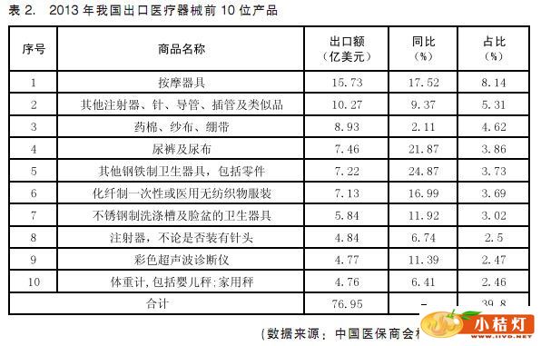 2013年,我国有41个类别的医疗器械出口额超过1亿美元,而2012年是43个类别。其中,按摩器具出口额最高,为15.73亿美元;2012年,矫形骨科类产品出口额同比增幅(210.66%)在各类产品中位居第一,然而2013年的同比增幅显著下降了42.46%,原因是委内瑞拉实施国民健康计划项目导致年度数据异常。排在前10位的出口医疗器械产品的出口额合计76.95亿美元,占医疗器械出口总额的39.8%。