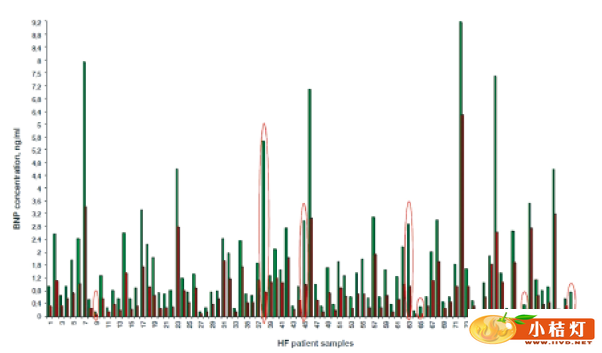 BNP的浓度通过SES检测系统(绿色)和西门子检测系统(红色)定