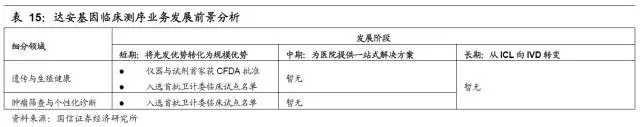 综上所述,我们认为基因检测有两大细分市场(遗传与生殖健康、肿瘤个性化诊断)和三大发展阶段(跑马圈地建立规模优势、丰富产品线为医院提供一站式解决方案、从ICL向IVD转变)。公司在每个领域的产品、技术储备和为每个发展阶段的布局成为我们判断公司发展潜力的分析框架。在此,我们建议投资者重点关注以下公司: