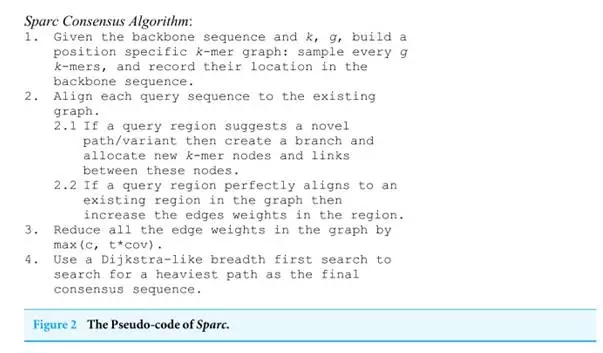 4、国内外布局三代测序的公司 国外布局三代测序的主要有Pacific Biosciences、Oxford Nanopore Technologies等公司,2015 年 10 月 27 日,国内公司瀚海基因(Direct Genomics)公布了基于 Helicos 技术研发的专门用于临床的第三代单分子测序仪 GenoCare 原理样机。中科院北京基因组研究所与浪潮基因组科学也在共同研制国产第三代基因测序仪。在测序仪价格方面,PACBIO 2011年的第一台三代测序仪PacBio RS在美国价格80万美金,2015年生产的sequel测序仪价格35万美金,大幅下降。在测序成本方面,预计未来5年内三代测序能达到100美元全基因组测序的价格。 目前,三代测序设备已实现稳定性、小型化,价格也在不断下降,分析软件不断丰富,我们认为随着准确度提升、平行测序能力和酶活性等问题的解决,第三代测序技术是未来发展趋势,实现大规模商业化将是大势所趋。 三、原文文献翻译缩减版 原文为《Sparc: a sparsity-based consensus algorithm for long erroneous sequencing reads》,鉴于PeerJ期刊2016年6月8日(影响因子为2.183,投稿命中率为52.22%,在各类SCI期刊中属于比较普通的水平) 摘要: Sparc软件通过高效的线性复杂度一致性算法,将目标基因组区域的序列构建k聚体图,帮助基因组的从头组装。权重最大的路径最近似于基因组真实序列,通过稀疏分解诱导的算法对序列图谱不断重新调整权重,从而得到一致性序列。Sparc 能够支持同时使用NGS和3GS数据,极大改善成本和计算方法有效性。使用测序深度为30× 的PacBio 数据,Sparc能够达到错误率低于0.5%;使用更具有挑战性的OxfordNanopore 数据,Sparc能够达到和NGS数据相似的错误率。与现行方法相比,Sparc对于一致序列的计算更加准确,并且节省80%的内存和时间。 前言: 与前面几代测序技术相比,三代测序技术在每个片段能够提供5-120kb的读长。然而,根据2012年和2015年两篇文献的介绍,Pac Bio测序错误率大约为15%(2012年),OxfordNanopore 测序的错误率高达40%(2015年),高的测序错误率为使用3GS测序进行基因组拼接提出了很大的挑战。 使用三代测序数据进行基因组的从头组装,主要需克服三个瓶颈:1)找到重复序列;2)序列对比;3)序列优化/序列纠错。高效地纠正这些长错误序列是个重大的难题,下图显示这三个主要挑战,其中最后一步是这篇文献的主要解决的问题: 一致性算法对于基因组拼接非常关键,有以下几个原因:1)一致性算法是汇编程序产生高质量输出结果的必要部分。2)纠错程序提高了输入序列的准确度。每个组装重叠序列(或者称为主干序列-backbone)作为靶序列,每次测序结果作为查询序列(query sequences)与靶序列对比。另一种情形,每个长错误测序结果作为靶序列,NGS或者3GS序列作为查询序列;通过同时使用NGS数据和3GS数据,即混合组装方法,是广泛采用的组装方法。由于NGS短序列的成本更低、准确率更高,因此将两种数据结合可以降低成本,并且缓解整个管线的计算压力。3)最后一个步骤占用了大部分的计算时间,因此,高效的一致性算法极大地加速了基因组组装过程。 我们借助了著名的de Bruijn/k聚体图,针对3GS数据设计了一种更简便的方法。在我们的sparc算法中,每个节点是一个k聚体,为节省内存,同一位置的k聚体进行合并,k聚体之间的连接的得分代表连接的可靠性,因此,最终得分最高的路径是最近似于一致序列。Sparc可以在低内存的条件下提供极好的结果,而不用使用其他作图简化技术。由于技术的简便性,此算法相比较主流的3GS测序项目PBdagcon,速度加快五倍,内存也节省五倍。此外,由于主流NGS测序数据的准确性(>99%)更高,所以利用成本更低的NGS代替部分高成本的3GS数据是值得的,在混合情形下,Sparc能够提供高质量的结果。