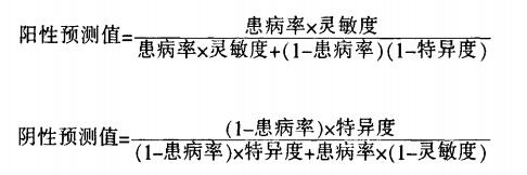预测值受灵敏度、特异度和患病率三者的影响。 在不同患病率的人群中.阳性结果的预测值不同。知 道一个试验方法的灵敏度、特异度。被测人群某病的 患病率,即可计算出当试验结果为阳性(或阴性)时, 该人患病的概率。在患病率不变的情况下。预测值随灵敏度和特异度的变动而变动,随着灵敏度升高、特 异度降低。阴性预测值升高,阳性预测值降低:当灵敏度、特异度不变时,随着患病率的升高。阳性预测值升 高,阴性预测值降低。